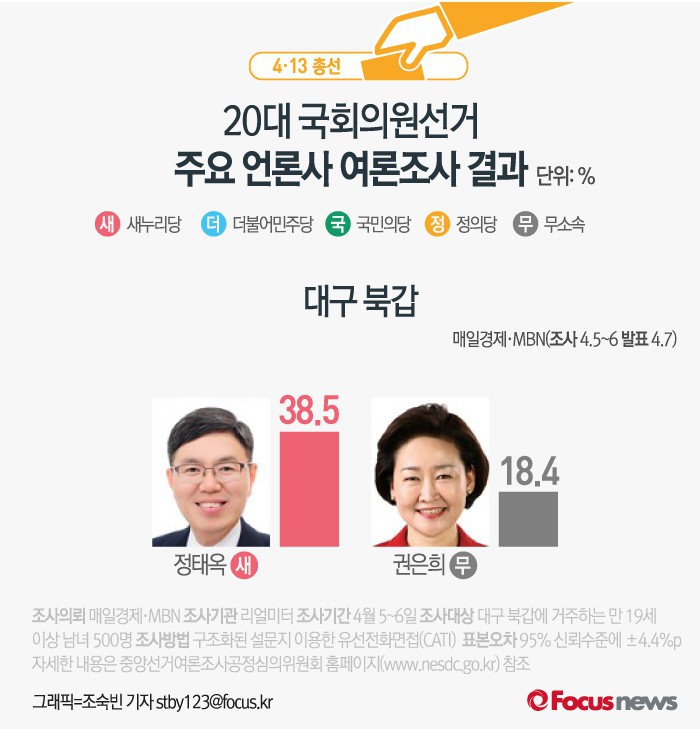 (서울=포커스뉴스) 매일경제와 MBN이 여론조사기관 리얼미터에 의뢰해 7일 발표한 결과에 따르면 대구 북갑에서 새누리당 정태옥 후보의 지지율은 38.5%, 무소속 권은희 후보의 지지율은 18.4%인 것으로 나타났다.