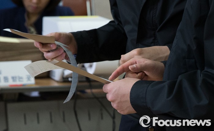 (인천=포커스뉴스) 제20대 국회의원 선거 사전투표 시작일인 8일 오전 인천 연수구 송도1동 주민센터에서 인천 중부해양경비안전본부 소속 해경들이 투표용지를 살펴보고 있다.