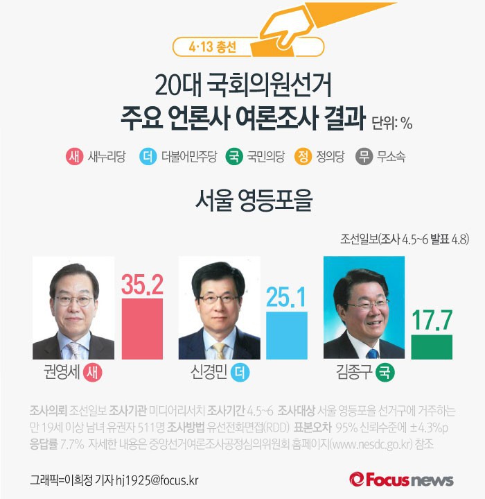 이번 조선일보 여론조사는 5~6일 서울 영등포을에 거주하는 만 19세 이상 남녀 511명을 대상 유선전화면접조사 방식으로 진행됐다. 표본오차는 95% 신뢰 수준에 ±4.3%p다.