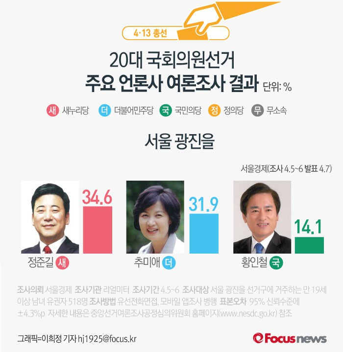 (서울=포커스뉴스) 서울경제가 리얼미터에 의뢰해 5~6일 실시한 서울 광진을 여론조사 결과에 따르면 새누리당 정준길 후보의 지지율은 34.6%, 더불어민주당 추미애 후보의 지지율은 31.9%, 국민의당 황인철 후보는 14.1%로 나타났다.