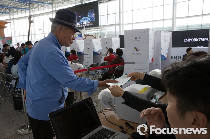 (서울=포커스뉴스) 4.13총선 사전투표 첫째날인 8일 오전 서울 용산구 서울역에 설치된 남영동 사전투표소에서 시민들이 투표를 하고 있다. 사전투표는 4.8~4.9일까지 진행된다.