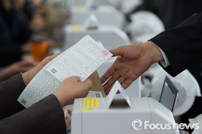 (서울=포커스뉴스) 4.13총선 사전투표 첫째날인 8일 오전 서울 용산구 서울역에 설치된 남영동 사전투표소에서 시민들이 투표를 하고 있다. 사전투표는 4.8~4.9일까지 진행된다.