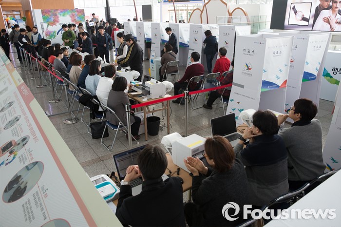 (서울=포커스뉴스) 4.13총선 사전투표 첫째날인 8일 오전 서울 용산구 서울역에 설치된 남영동 사전투표소에서 시민들이 투표를 하고 있다. 사전투표는 4.8~4.9일까지 진행된다.