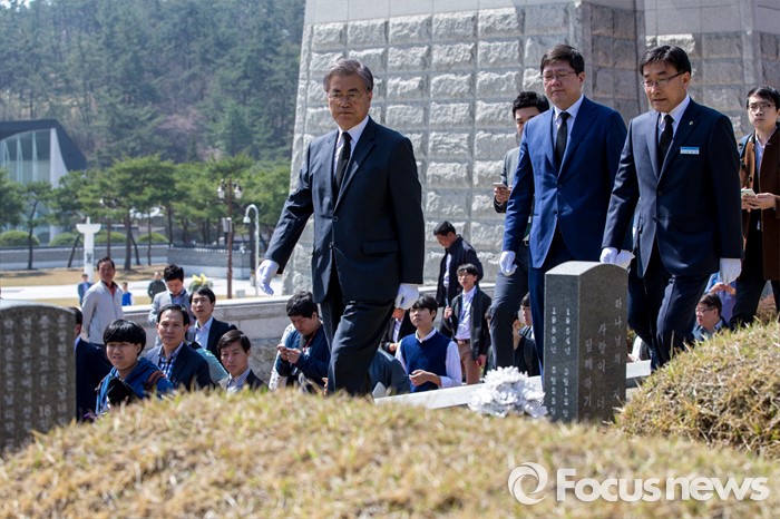 (광주=포커스뉴스) 문재인 더불어민주당 전 대표와 김홍걸 국민통합위원장이 8일 오전 전남 광주 5.18 민주묘지를 찾아 민주열사 묘지를 둘러 보고 있다.