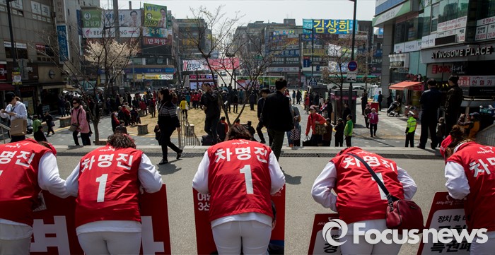 (부천=포커스뉴스) 8일 오전 경기 부천시 역곡역 인근에서 열린 차명진 새누리당 부천소사구 후보 지원유세에서 차 후보의 선거사무원이 시민들에게 허리 숙여 인사하고 있다.