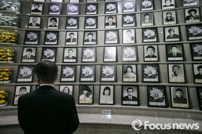 (광주=포커스뉴스) 문재인 더불어민주당 전 대표가김홍걸 국민통합위원장과 함께 8일 오전 광주 북구 국립5.18민주묘지 내 유영봉안소를 방문해 참배 후 영정을 살펴보고 있다.