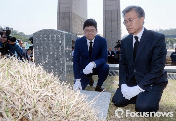 (광주=포커스뉴스) 8일 오전 광주 국립 518묘지를 찾은 더불어민주당 문재인(오른쪽) 전 대표와 김홍걸 국민통합위원장이 묘역을 참배하고 있다.