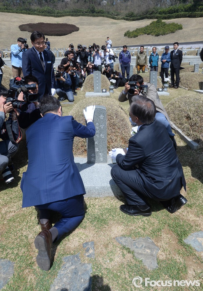 (광주=포커스뉴스) 8일 오전 광주 국립 518묘지를 찾은 더불어민주당 문재인(오른쪽) 전 대표와 김홍걸 국민통합위원장이 윤상원 열사 묘역을 참배하고 있다.
