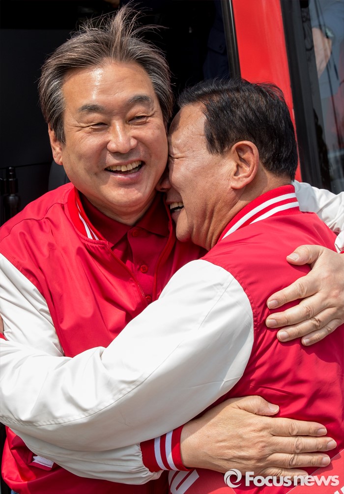 (부천=포커스뉴스) 8일 오후 경기 부천시 역곡역 인근에서 이사철 새누리당 부천원미을 후보 지원유세에 나선 김무성 대표가 이 후보와 포옹하고 있다.