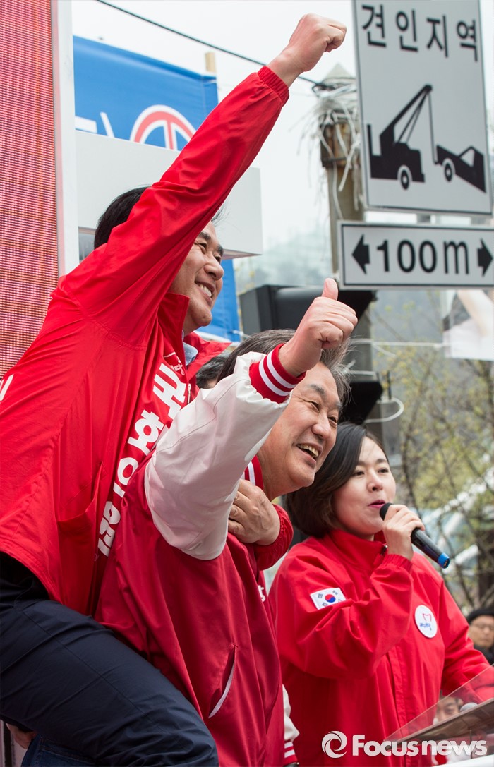 (김포=포커스뉴스) 8일 오후 경기 김포시 사우동 인근에서 김동식 새누리당 김포갑, 홍철호 김포을 후보 합동지원유세에 나선 김무성 대표가 김 후보를 업어주고 있다.