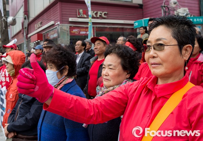 (김포=포커스뉴스) 8일 오후 경기 김포시 사우동 인근에서 열린 김동식 새누리당 김포갑, 홍철호 김포을 후보 합동지원유세에서 지지자들이 박수치고 있다.