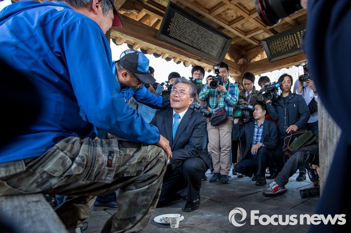 (광주=포커스뉴스) 문재인 더불어민주당 전 대표가 8일 오후 광주시 서구 광주공원 앞에서 주민들과 대화를 나누고 있다.