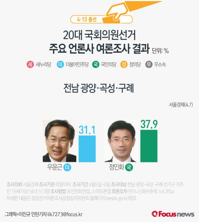 (서울=포커스뉴스) 서울경제가 여론조사기관 리얼미터에 의뢰해 7일 발표한 결과에 따르면 전남 광양·곡성·구례에서 더불어민주당 우윤근 후보의 지지율은 31.1%,국민의당 정인화 후보의 지지율은 37.9%인 것으로 나타났다.
