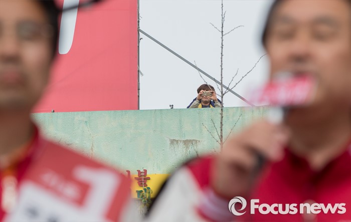 (고양=포커스뉴스) 8일 오후 경기 고양시 화정역 광장에서 열린 손범규 새누리당 고양갑, 김태원 고양을 후보 합동지원유세에서 한 시민이 휴대폰으로 유세현장을 촬영하고 있다.
