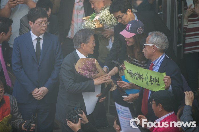 (광주=포커스뉴스) 문재인 더불어민주당 전 대표가 8일 오후 광주광역시 동구 충장로에서 기자회견을 열고 '광주시민께 드리는 글'을 발표하기 전 한 지지자에게 꽃다발을 받고 있다.