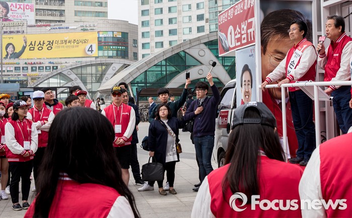 (고양=포커스뉴스) 8일 오후 경기 고양시 화정역 광장에서 손범규 새누리당 고양갑, 김태원 고양을 후보 합동지원유세를 가진 김무성 대표가 유권자들의 지지를 호소하고 있다.