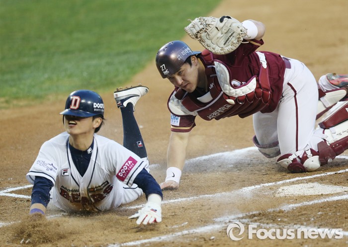 (서울=포커스뉴스) 8일 서울 잠실구장에서 열린 2016 프로야구 넥센-두산 경기 1회말 1사 1,3루에서 더블스틸을 시도하던 두산 3루주자 정수빈이 홈에서 넥센 포수 박동원에게 태그아웃 되고 있다.