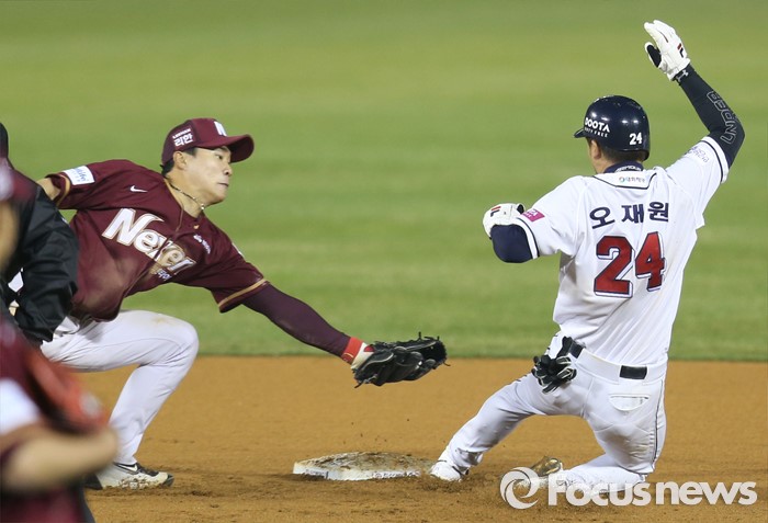 (서울=포커스뉴스) 8일 서울 잠실구장에서 열린 2016 프로야구 넥센-두산 경기 6회말 볼넷으로 진루한 두산 오재원이 오재일 타석때 넥센 투수 오재영의 견제구에 걸렸으나 1루수 채태인의 송구 실책으로 2루에서 세이프되고 있다.