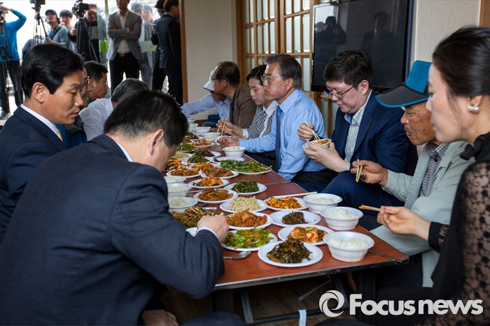 (광주=포커스뉴스) 문재인 더불어민주당 전 대표와 김홍걸 국민통합위원장이 9일 오전 광주광역시 서구 발산마을회관을 방문해 어르신들과 간담회를 마친 뒤 식사 하고 있다.