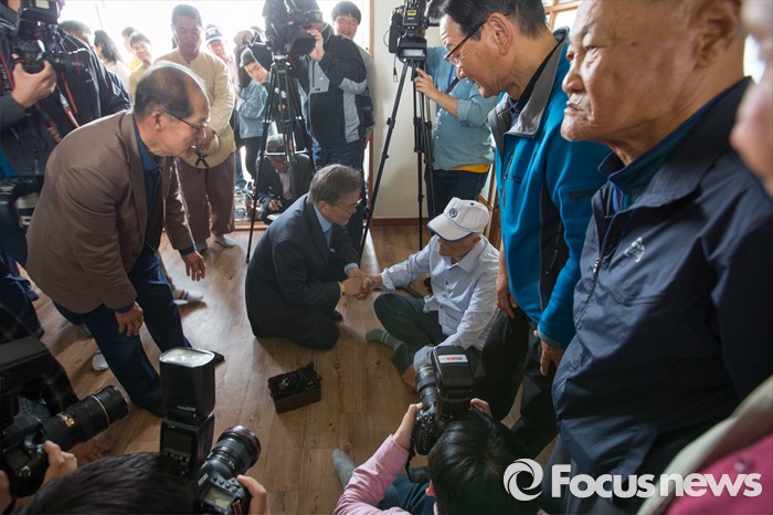 (광주=포커스뉴스) 문재인 더불어민주당 전 대표가 9일 오전 광주광역시 서구 발산마을회관을 방문해 어르신들과 인사 하고 있다.