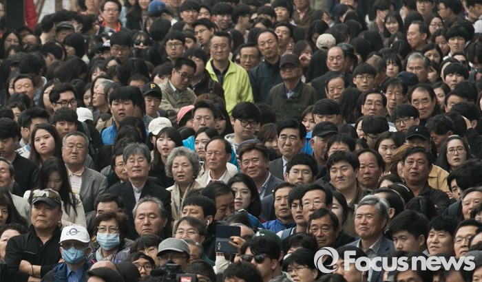 (원주=포커스뉴스) 제20대 국회의원 선거를 나흘 앞둔 9일 오전 강원도 원주시 치악로 남부시장 앞에서 시민들이 김무성 새누리당 대표의 김기선 원주갑, 이강후 원주을 후보 지원유세를 보고 있다.