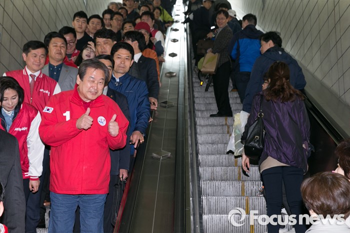 (성남=포커스뉴스) 제20대 국회의원 선거를 나흘 앞둔 9일 오후 성남시 분당구 야탑역 에스컬레이터에서 김무성(앞줄 왼쪽 두번째) 새누리당 대표가 시민들에게 지지를 호소하고 있다.