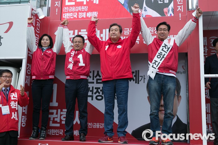 (성남=포커스뉴스) 제20대 국회의원 선거를 나흘 앞둔 9일 오후 성남시 분당구 야탑역 광장에서 김무성(오른쪽 두번째) 새누리당 대표가 권혁세(가운데) 분당갑, 전하진(오른쪽) 분당을 후보 지원유세를 하며 손을 들고 있다.