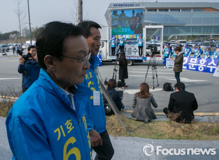 (세종=포커스뉴스) 9일 오후 세종시 국립세종도서관 앞에서 이해찬 무소속 세종시 후보가 김종인 더불어민주당 비대위 대표 겸 선대위원장의 지원유세가 예정된 문흥수 세종시 후보의 유세장 앞을 지나고 있다.