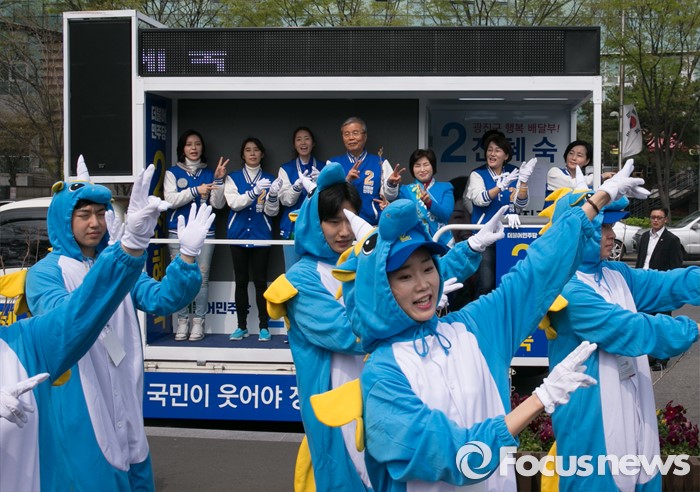 (서울=포커스뉴스) 김종인 더불어민주당 비대위 대표 겸 선대위원장과 전혜숙 광진갑 후보가 10일 오전 서울 어린이대공원 앞에서 선거유세를 하며 지지를 호소하고 있다.