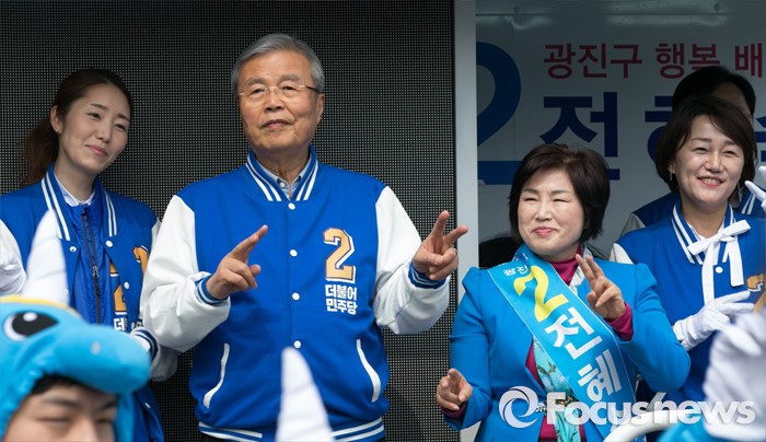 (서울=포커스뉴스) 김종인 더불어민주당 비대위 대표 겸 선대위원장과 전혜숙 광진갑 후보가 10일 오전 서울 어린이대공원 앞에서 선거유세를 하며 지지를 호소하고 있다.
