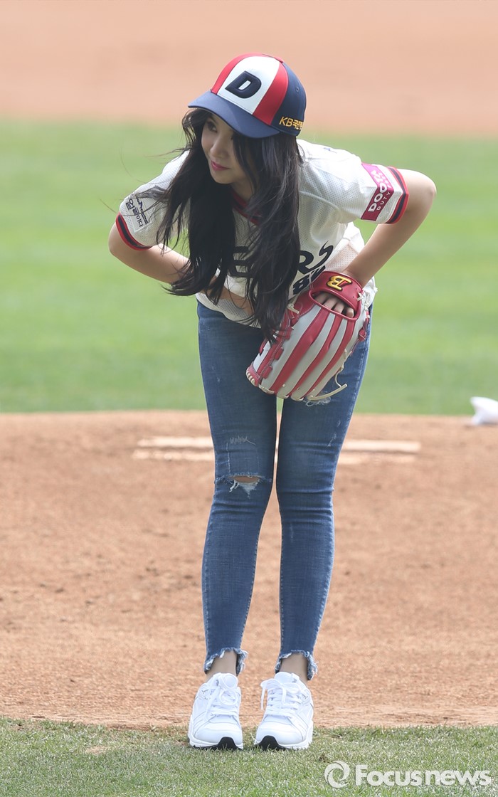 (서울=포커스뉴스) 10일 서울 잠실구장에서 열린 2016 프로야구 넥센-두산 경기에서 시구자로 나온 걸그룹 피에스타의 차오루가 관중에게 배꼽인사하고 있다.