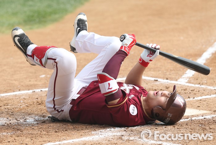 (서울=포커스뉴스) 10일 서울 잠실구장에서 열린 2016 프로야구 넥센-두산 경기에서 3회초 넥센 김하성이 타석에서 헛스윙후 중심을 잃고 넘어져 있다.