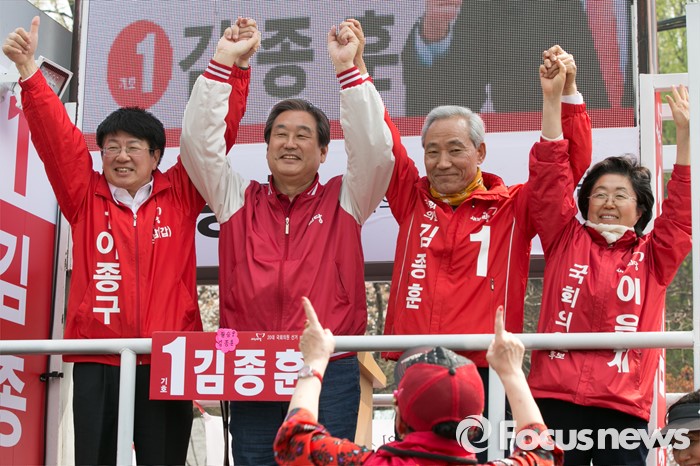 (서울=포커스뉴스) 김무성(왼쪽 두번째) 새누리당 대표가 10일 오후 서울 강남구 수서역 앞에서 이종구(왼쪽) 강남갑, 김종훈(오른쪽 두번째) 강남을, 이은재(오른쪽) 강남병 합동 지원유세를 하고 있다.