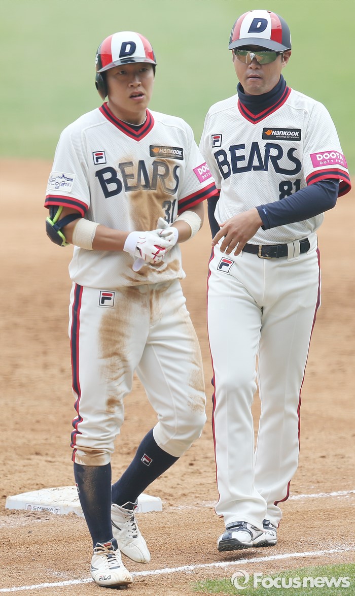 (서울=포커스뉴스) 10일 서울 잠실구장에서 열린 2016 프로야구 넥센-두산 경기 4회말 2사 만루에서 두산 정수빈이 2타점 내야안타를 치고 1루에서 장갑을 벗고 있다. 오른쪽은 강동우 코치.