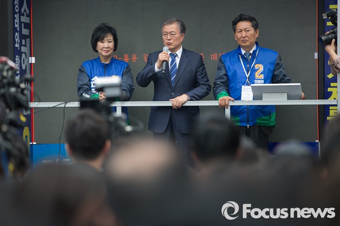 (서울=포커스뉴스) 문재인 더불어민주당 전 대표가 10일 오후 서울 마포구 홍익대학교 앞에서 손혜원 더불어민주당 마포을 후보의 지지를 호소하고 있다.