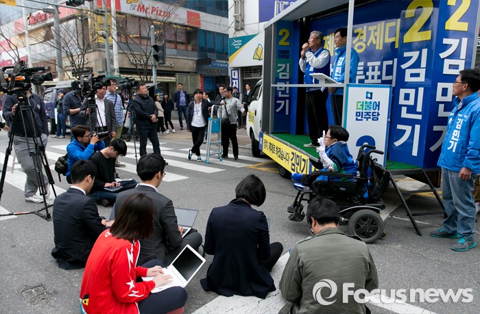 (용인=포커스뉴스) 김종인(왼쪽) 더불어민주당 비대위 대표 겸 선대위원장과 김민기 용인을 후보가 10일 오후 경기도 기흥구청 인근 거리에서 선거유세를 하고 있다.