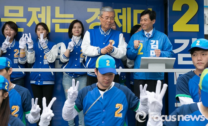 (용인=포커스뉴스) 김종인(왼쪽) 더불어민주당 비대위 대표 겸 선대위원장과 김민기 용인을 후보가 10일 오후 경기도 기흥구청 인근 거리에서 선거유세를 하고 있다.