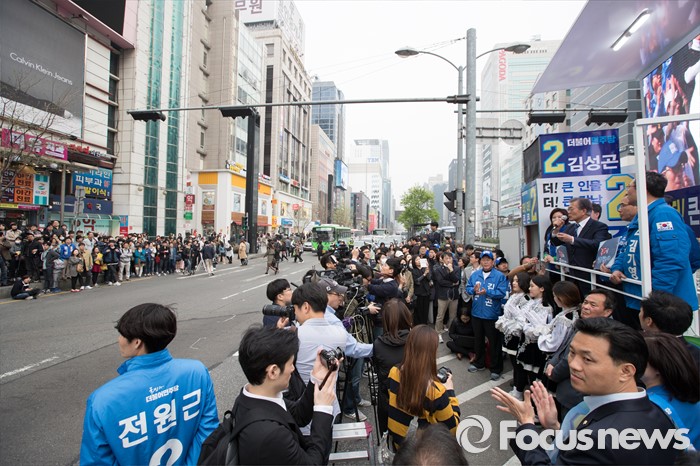(서울=포커스뉴스) 10일 오후 서울 CGV 강남점 앞에서 이정근(왼쪽부터) 더불어민주당 서초갑 후보, 전원근 강남병 후보, 문재인 전 대표, 김성곤 강남갑 후보, 김기영 서초을 후보가 유권자들에게 지지를 호소하고 있다.