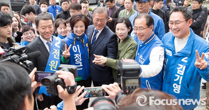(서울=포커스뉴스) 문재인 더불어민주당 전 대표가 10일 오후 서울 CGV 강남점 앞에서 전원근(왼쪽부터) 더불어민주당 강남병 후보, 이정근 서초갑 후보, 문재인 전 대표, 김성곤 강남갑 후보, 김기영 서초을 후보를 비롯한 시민이 함께 기념촬영을 하고 있다.
