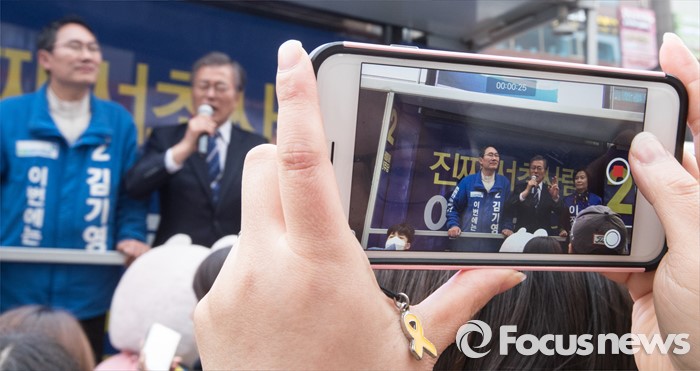 (서울=포커스뉴스) 문재인 더불어민주당 전 대표가 10일 오후 서울 CGV 강남점 앞에서 김기영 서초을 후보, 이정근 서초갑 후보와 함께 유권자들에게 지지를 호소하고 있다.