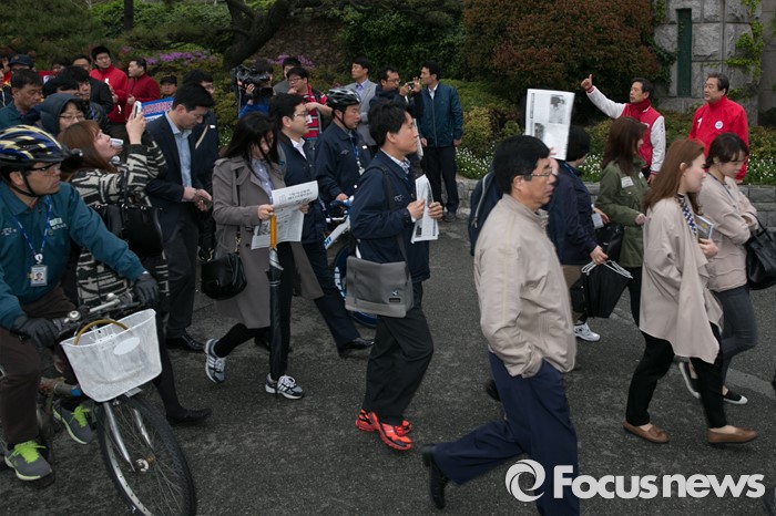 (울산=포커스뉴스) 김무성(오른쪽) 새누리당 대표가 11일 오전 울산시 동구 현대중공업 앞에서 안효대 울산 동구 후보 지원유세를 하고 있다.