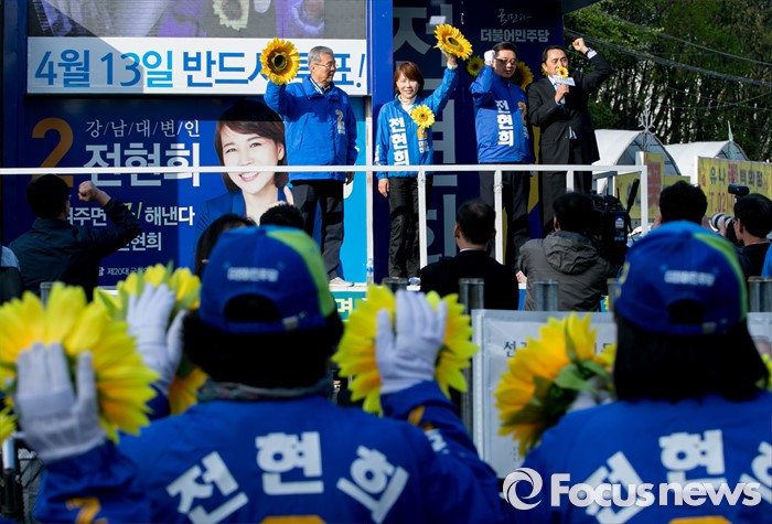 (서울=포커스뉴스) 20대 총선을 이틀 앞둔 11일 오전 서울 지하철 수서역 인근 거리에서 김종인 더불어민주당 비대위 대표 겸 선대위원장과 전현희 강남을 후보가 지지를 호소하고 있다.