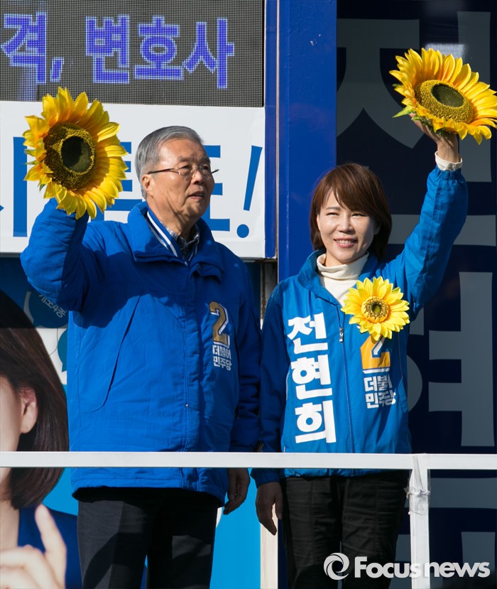 (서울=포커스뉴스) 20대 총선을 이틀 앞둔 11일 오전 서울 지하철 수서역 인근 거리에서 김종인(왼쪽) 더불어민주당 비대위 대표 겸 선대위원장과 전현희 강남을 후보가 지지를 호소하고 있다.