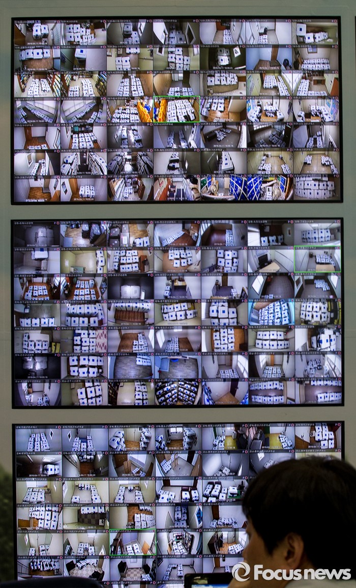 (과천=포커스뉴스) 4.13 총선을 이틀 앞둔 11일 오전 경기 과천 중앙선거관리위원회 내 관내사전투표함 보관장소 CCTV통합관제센터에서 선관위 관계자들이 실시간으로 투표함을 감시하고 있다.