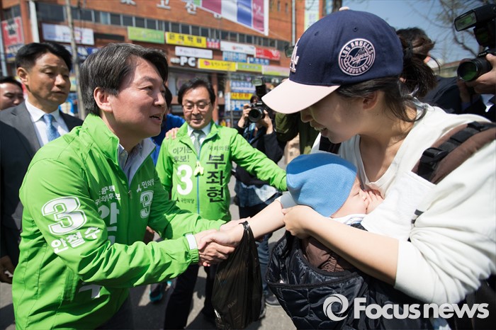 (안산=포커스뉴스) 안철수 국민의당 상임공동대표(가운데)가 11일 오전 안산시 단원구 고잔성당 사거리에서 부좌현 안산시 단원구을 후보 지원유세를 하고 있다.