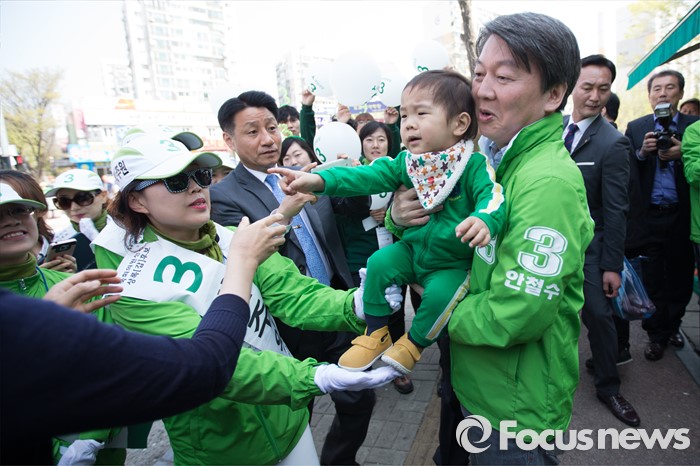 (안산=포커스뉴스) 안철수 국민의당 상임공동대표(가운데)가 11일 오전 안산시 단원구 고잔성당 사거리에서 부좌현 안산시 단원구을 후보 지원유세를 하고 있다.