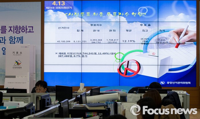 이번 조사는 중앙선관위가 여론조사기관 리서치앤리서치에 의뢰, 전국의 만 19세 이상 유권자 1500명을 대상으로 지난 4월 3일과 4일 전화면접을 통해 진행됐으며, 응답률은 9.1%, 표본오차는 95% 신뢰수준에서 ±2.5%p이다.4.13 총선을 이틀 앞둔 11일 오전 경기 과천 중앙선거관리위원회 내 제20대 국회의원선거상황실 화면에 사전투표 최종 투표자수 현황이 표시되고 있다. 2016.04.11 양지웅 기자