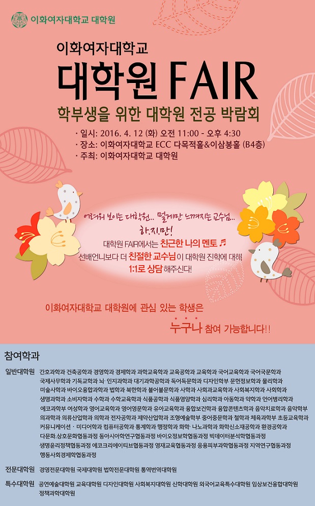 별도의 사전 신청절차 없이 대학원 진학에 관심 있는 학생이라면 누구나 참여 가능하다.이화여대 대학원이 12일에 개최하는 '제11회 대학원FAIR' 포스터. <사진제공=이화여자대학교>