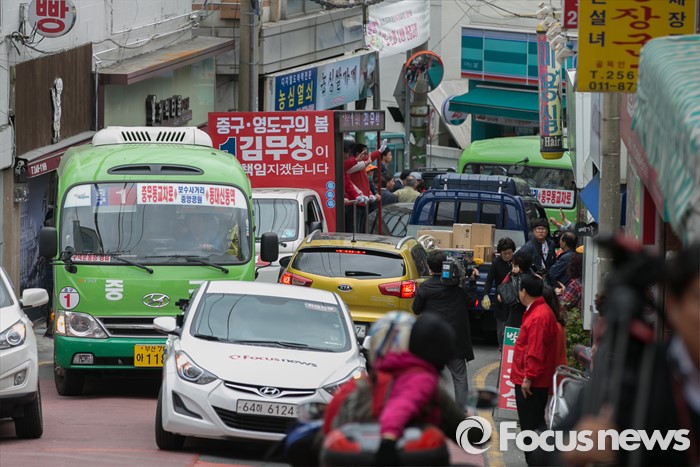 (부산=포커스뉴스) 제20대 총선에서 부산 중구영도에 출마한 김무성 새누리당 대표가 11일 오후 부산 중구 보수동 책방골목에서 유세차량을 타고 선거운동을 하고 있다.