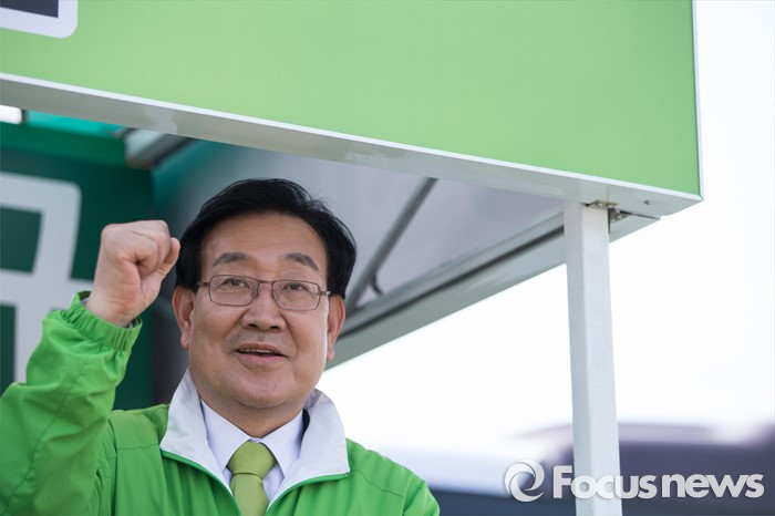(평택=포커스뉴스) 이계안 국민의당 평택시을 후보가 11일 오후 안산시 평택역 광장 앞에서 파이팅을 하고 있다.